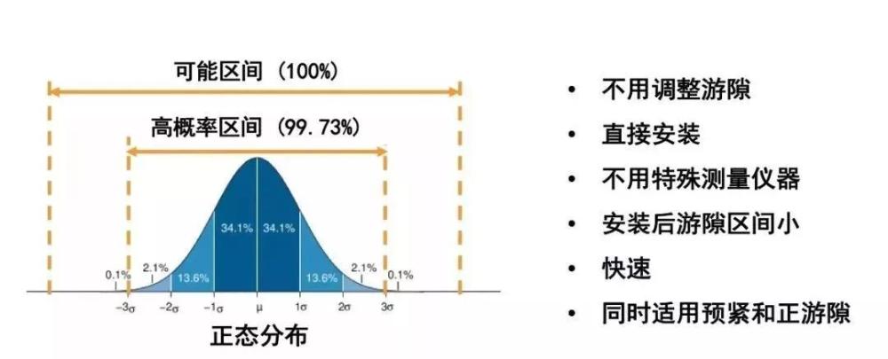 Set-Right使用概率方法并控制相關(guān)零件的尺寸公差來確保所有的裝配總成中有99.73%的軸承游隙落在可接受的范圍內(nèi)。這是一組隨機變量組合后的數(shù)學預(yù)測,變量就是軸承公差和軸、軸承座等安裝組件的公差。